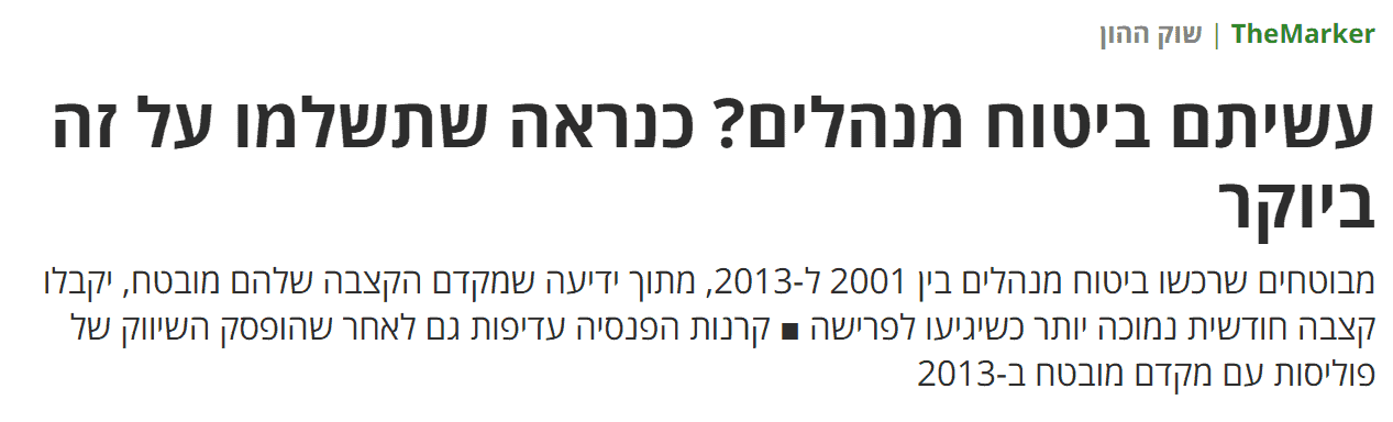 "לכן, מי שמחזיק בביטוח מנהלים מוכרח לבצע בדיקה יסודית של החיסכון הפנסיוני שלו – החל מהתשואות אותן הרוויח, דרך דמי הניהול אותם הוא משלם, ועד ניכוי האחוזים על ההפקדות השוטפות לחיסכון ועל הביטוח עצמו. ומומלץ לעשות זאת כמה שיותר מהר וכמה שיותר שנים אחורה".